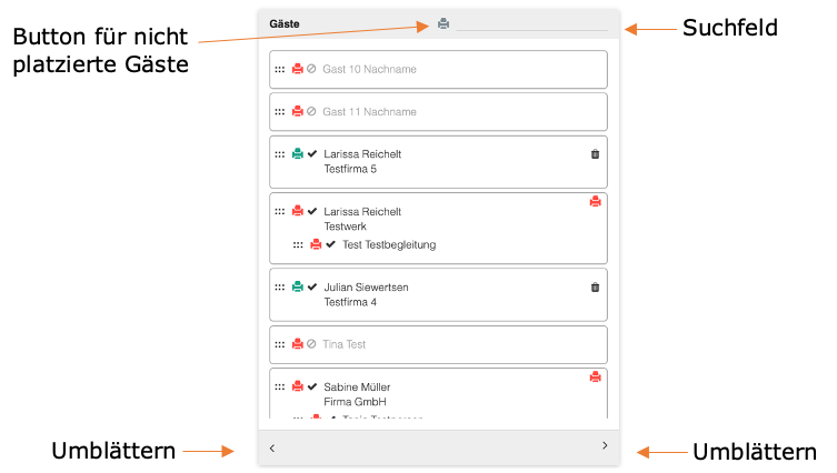 Mit den Pfeilen am Ende der Box können Sie in der Gästeliste blättern.